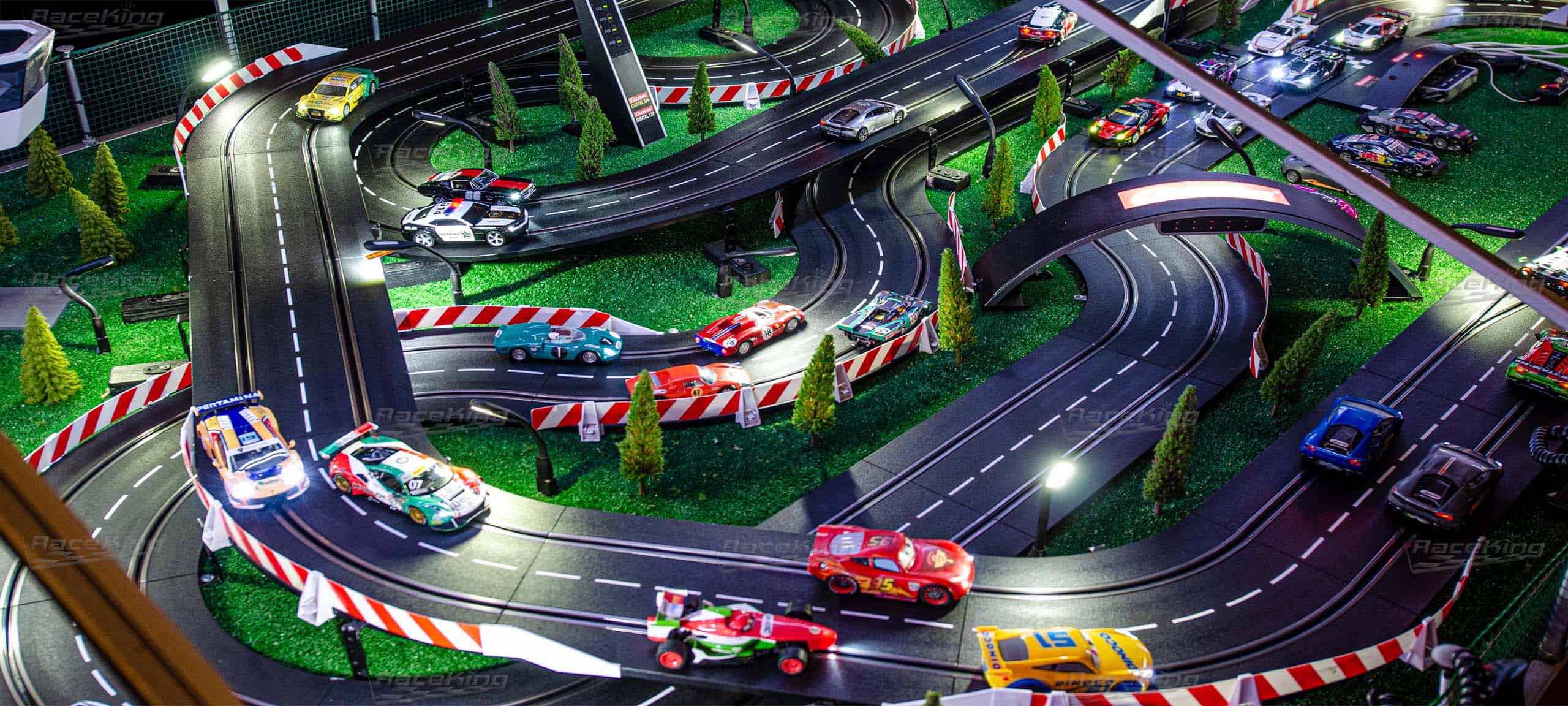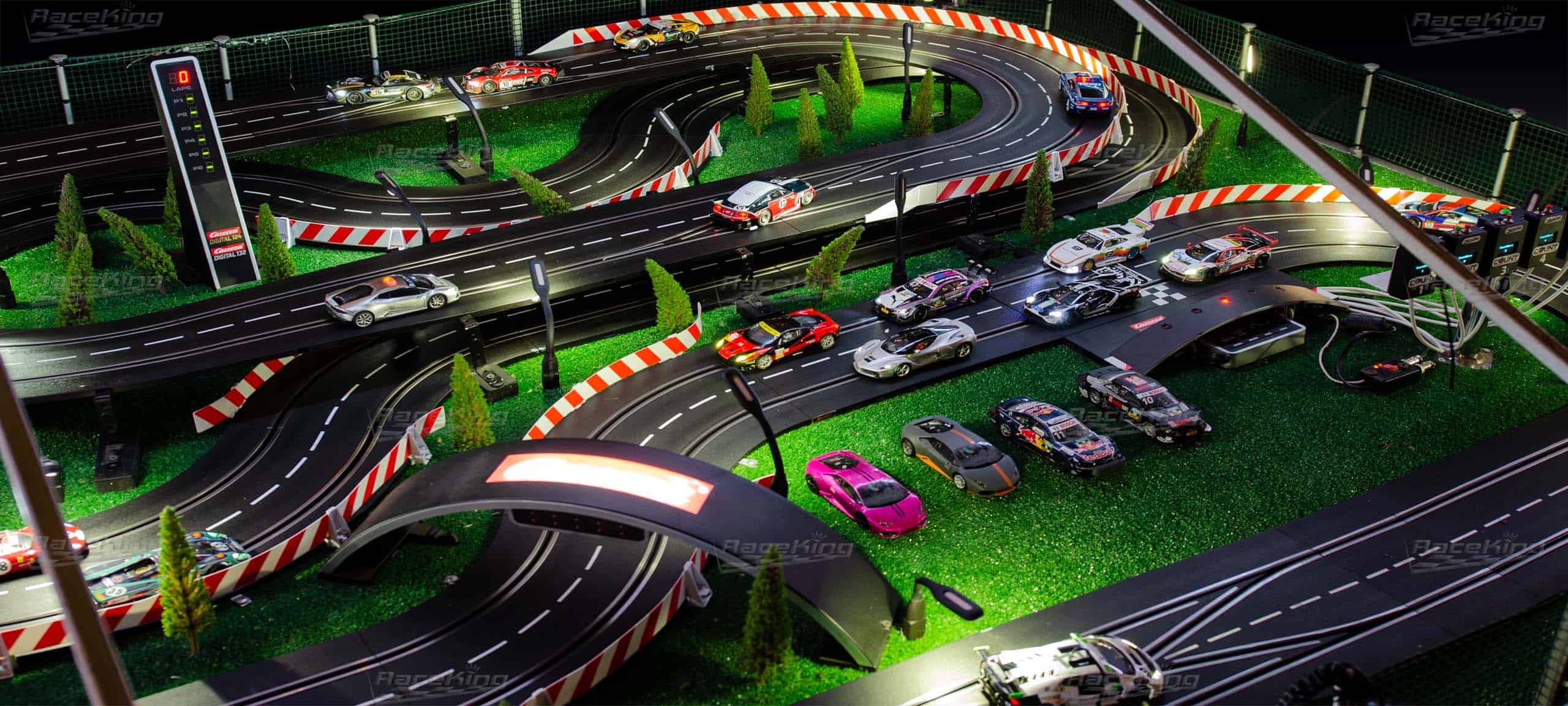 RaceKing Digital Rocket Racer – это уникальный трек, построенный на базе 32 масштаба. Трек имеет двухуровневую конфигурацию, что придаёт особый интерес но и добавляет сложность в прохождении трассы. Тут практически нет прямых участков, поэтому Вам следует быть готовыми к резким ускорениям и таким же резким уменьшениям скорости вашего авто. На треке есть участки, где Вы можете выбивать и обгонять соперников, либо просто выполнить перестроение вашего авто на другую полосу движения.